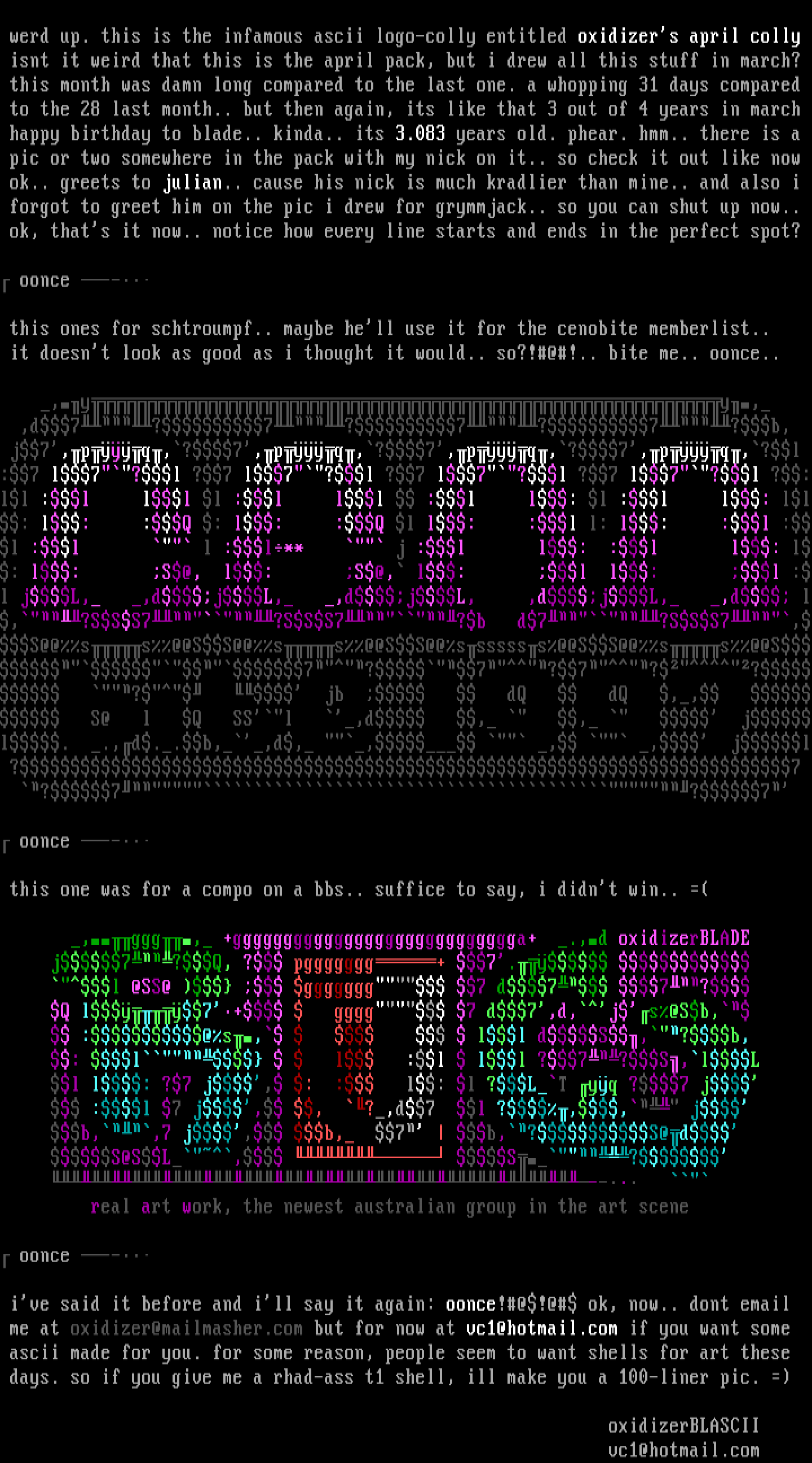 werd up. this is the infamous ascii logo-colly entitled oxidizers april colly
