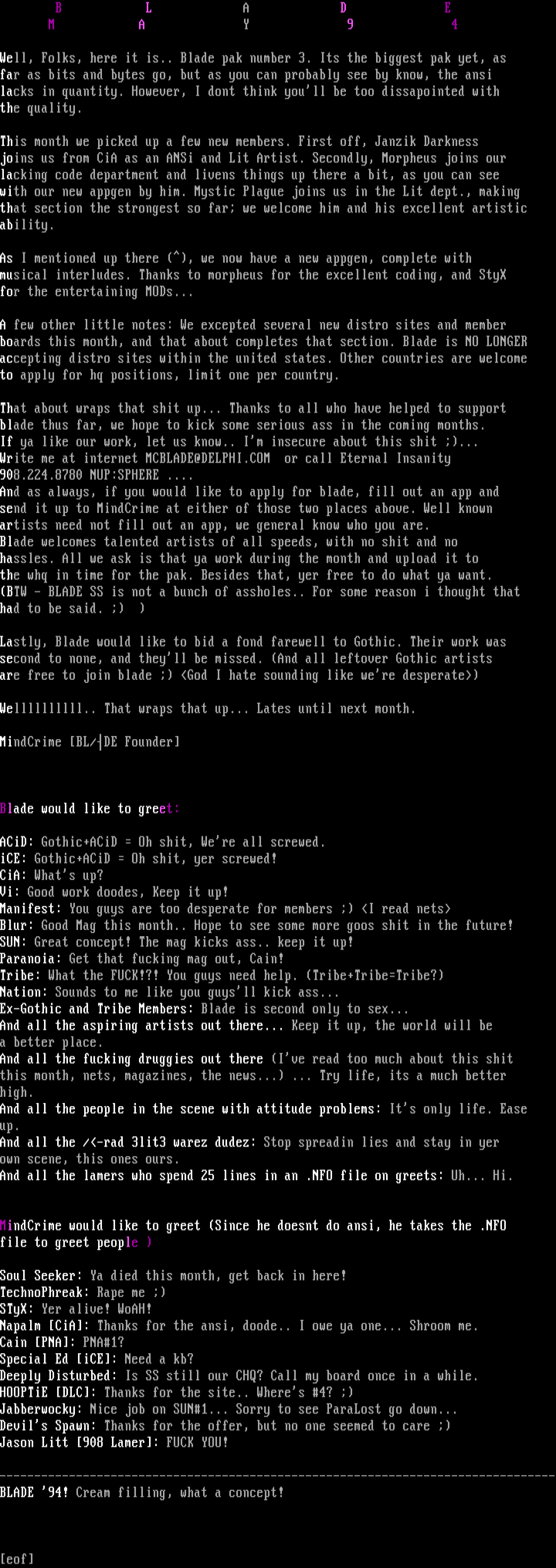 Write me at internet MCBLADE@DELPHI.COM or call Eternal Insanity