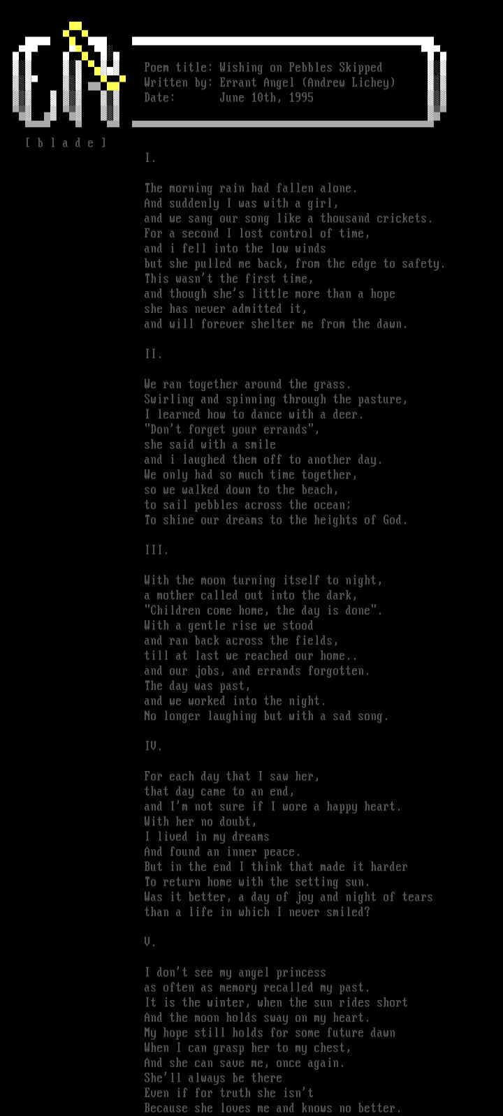 - 'wishing on pebbles skipped'