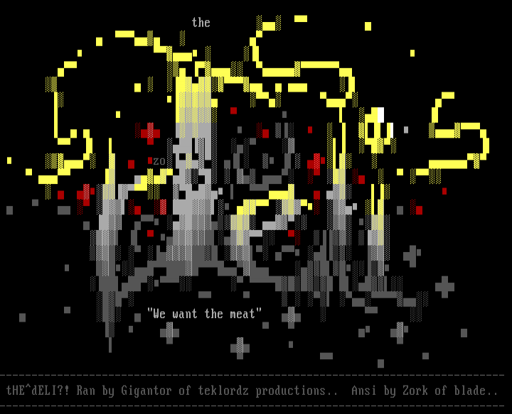tHEdELI?! Ran by Gigantor of teklordz productions.. Ansi by Zork of blade..