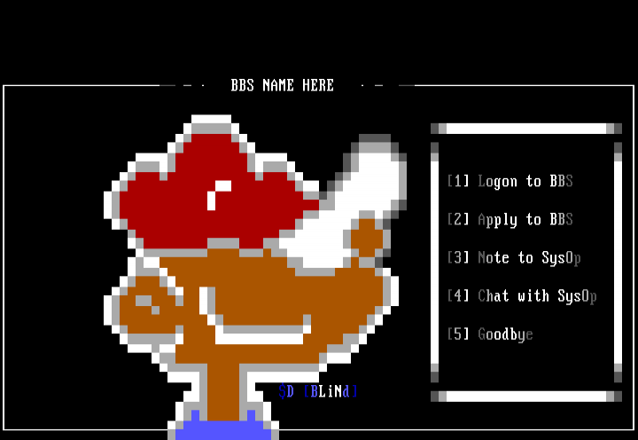 BBS NAME HERE 1 Logon to BBS 2 Apply to BBS 3 Note to SysOp 4 Chat with SysOp 5 Goodbye D BLiNd