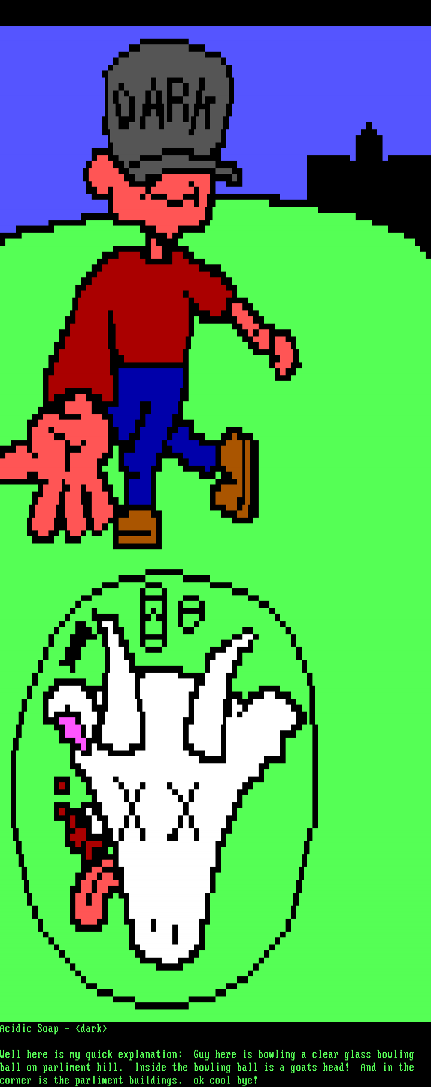 ball on parliment hill. Inside the bowling ball is a goats head! And