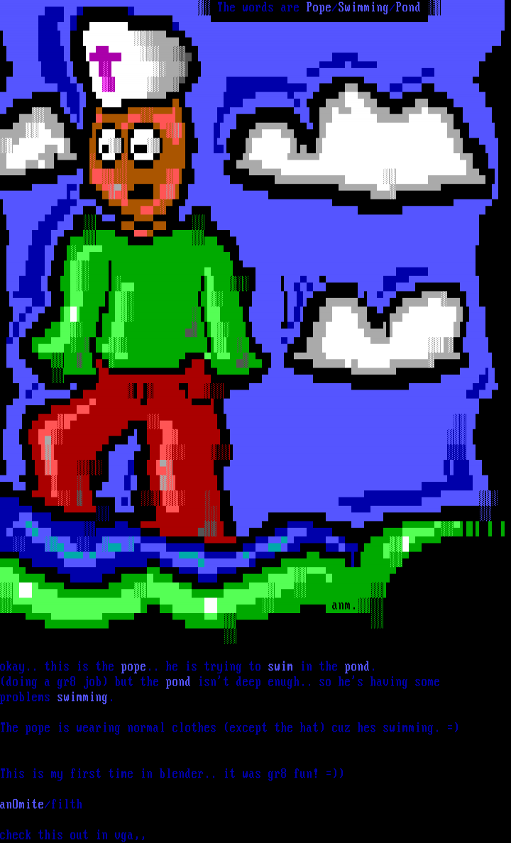 The pope is wearing normal clothes except the hat cuz hes swimming.