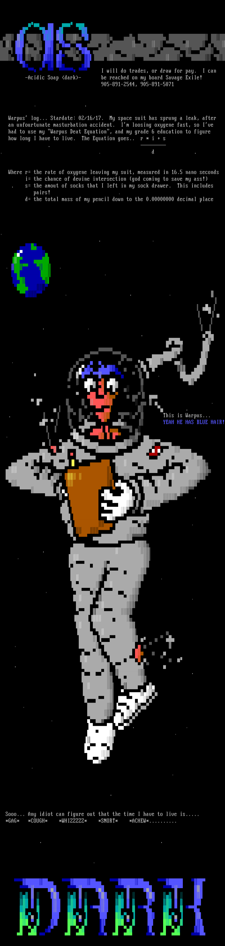 Warpus log... Stardate: 02/16/17. My space suit has sprung a leak