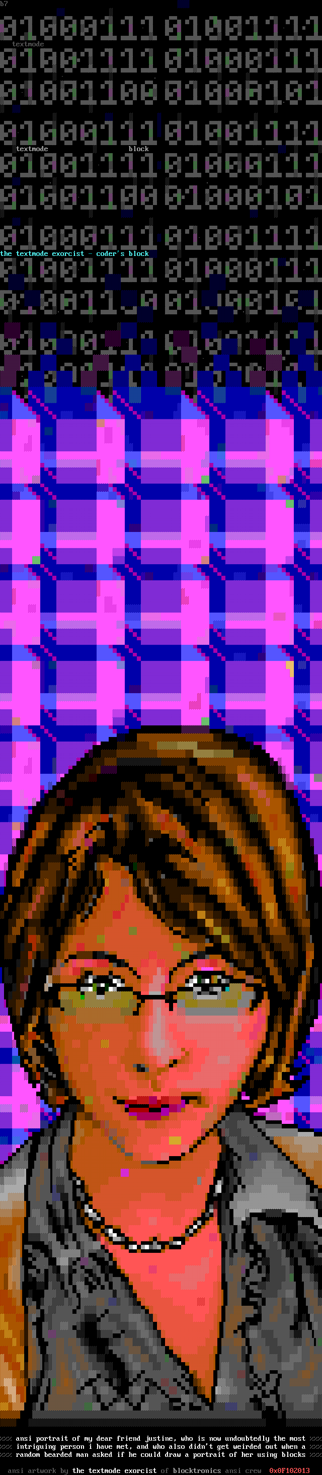 ansi portrait of my dear friend justine, who is now undoubtedly the most intriguing person i have met, and who also didnt get weirded out when a random bearded man asked if he could draw a portrait of her using blocks