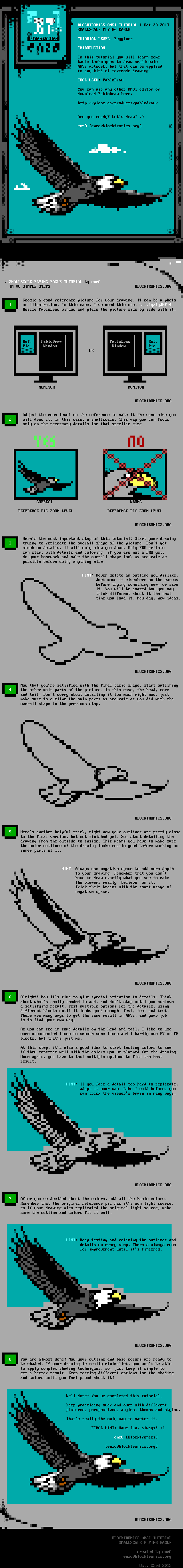 BLOCKTRONICS ANSi TUTORIAL Oct.23.2013 SMALLSCALE FLYING EAGLE BLOCKTRONICS TUTORIAL LEVEL: Begginer INTRODUCTION In this tutorial you will learn some basic techniques to draw smallscale ANSi artwork, but that can be applied to any kind of textmode drawing. TOOL USED: PabloDraw You can use any other ANSi editor or download PabloDraw here: http://picoe.ca/products/pablodraw/ Are you ready? Lets draw! : enzO enzo@blocktronics.org