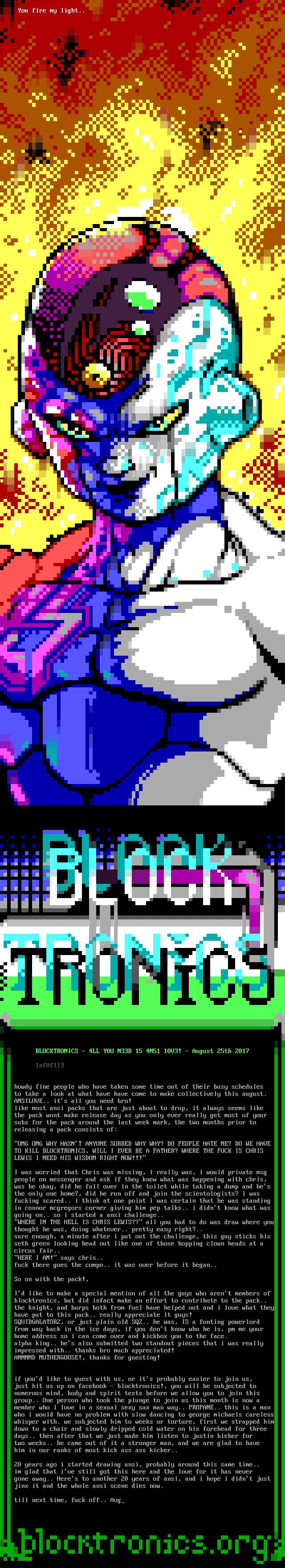 BLOCKTRONICS - 4LL Y0U N33D 15 4N51 10V3! - August 25th 2017 1nf0f1l3 howdy fine people who have taken some time out of their busy schedules to take a look at what have have come to make collectively this august. ANSILOVE.. its all you need bro! like most ansi packs that are just about to drop, it always seems like the pack wont make release day as you only ever really get most of your subs for the pack around the last week mark, the two months prior to releasing a pack consists of: OMG OMG WHY HASNT ANYONE SUBBED WHY WHY? DO PEOPLE HATE ME? DO WE HAVE TO KILL BLOCKTRONICS, WILL I EVER BE A FATHER? WHERE THE FUCK IS CHRIS LEWIS I NEED HIS WISDOM RIGHT NOW!!! I was worried that Chris was missing, i really was, i would private msg people on messenger and ask if they knew what was happening with chris, was he okay, did he fall over in the toilet while taking a dump and hes the only one home?, did he run off and join the scientologists? i was fucking scared.. i think at one point i was certain that he was standing in connor mcgregors corner giving him pep talks.. i didnt know what was going on.. so i started a ansi challenge.. WHERE IN THE HELL IS CHRIS LEWIS?? all you had to do was draw where you thought he was, doing whatever.. pretty easy right?.. sure enough, a minute after i put out the challenge, this guy sticks his seth green looking head out like one of those bopping clown heads at a circus fair.. HERE I AM! says chris.. fuck there goes the compo.. it was over before it began.. So on with the pack!, Id like to make a special mention of all the guys who arent members of blocktronics, but did infact make an effort to contribute to the pack.. the knight, and burps both from fuel have helped out and i love what they have put to this pack.. really appreciate it guys! SQUIDGALATOR2, or just plain old SQ2.. he was, IS a fonting powerlord from way back in the ice days, if you dont know who he is, pm me your home address so i can come over and kickbox you to the face. alpha king.. hes also submitted two standout pieces that i was really impressed with.. thanks bro much appreciated! ANNNND MUTHERGOOSE!, thanks for guesting! if youd like to guest with us, or its probably easier to join us, just hit us up on facebook - blocktronics!, you will be subjected to numerous mind, body and spirit tests before we allow you to join this group.. One person who took the plunge to join us this month is now a member who i love in a sexual sexy sax man way.. PROPANE.. this is a man who i would have no problem with slow dancing to george michaels careless whisper with. we subjected him to weeks or torture, first we strapped him down to a chair and slowly dripped cold water on his forehead for three days.. then after that we just made him listen to justin bieber for two weeks.. he came out of it a stronger man, and we are glad to have him in our ranks of most kick ass ass kicker.. 20 years ago i started drawing ansi, probably around this same time.. im glad that ive still got this here and the love for it has never gone away.. Heres to another 20 years of ansi, and i hope i didnt just jinx it and the whole ansi scene dies now. till next time, fuck off.. Avg