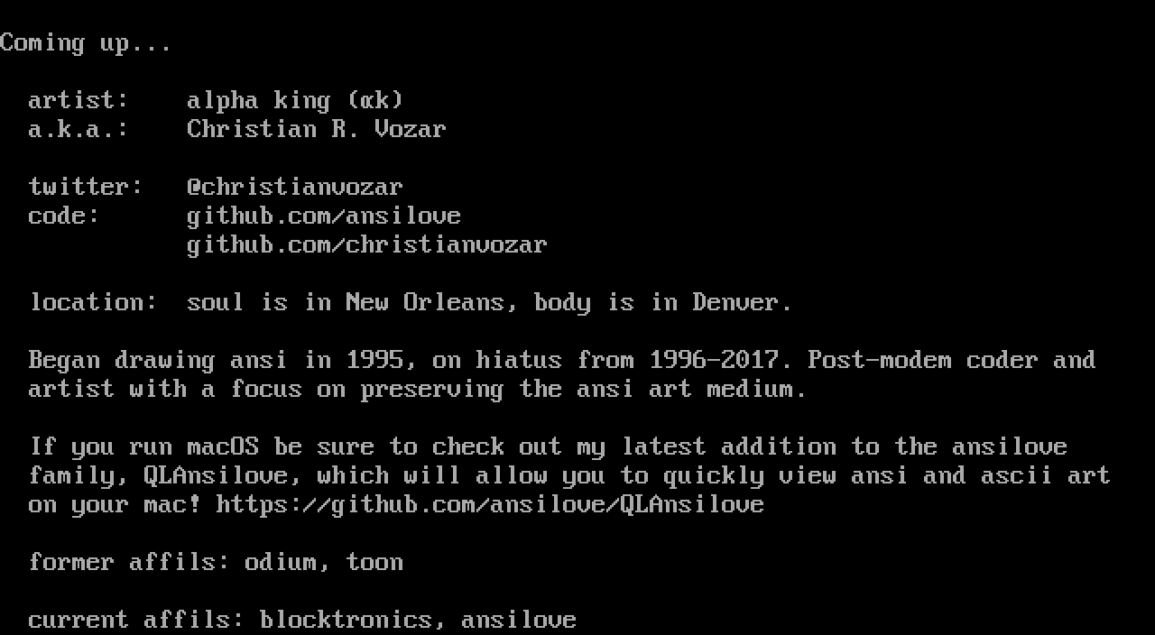 Began drawing ansi in 1995, on hiatus from 1996-2017. Post-modem coder and