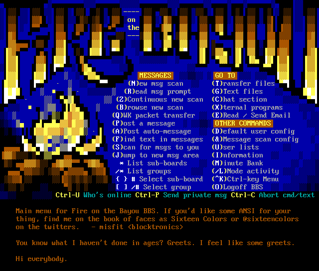 Main menu for Fire on the Bayou BBS. If youd like some ANSI for your