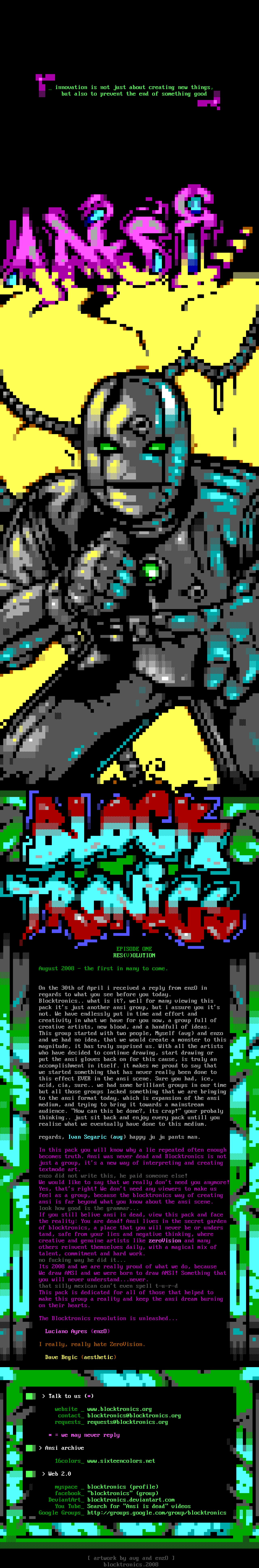 RESVOLUTION August 2008 - the first in many to come. On the 30th of April i received a reply from enzO in regards to what you see before you today. Blocktronics.. what is it?, well for many viewing this pack its just another ansi group, but i assure you its not. We have endlessly put in time and effort and creativity in what we have for you now, a group full of creative artists, new blood, and a handfull of ideas. This group started with two people, Myself avg and enzo and we had no idea, that we would create a monster to this magnitude, it has truly suprised us. With all the artists who have decided to continue drawing, start drawing or put the ansi gloves back on for this cause, is truly an accomplishment in itself. it makes me proud to say that we started something that has never really been done to this effect EVER in the ansi scene. Sure you had, ice, acid, cia, sure.. we had some brilliant groups in our time but all those groups lacked something that we are bringing to the ansi format today. which is expansion of the ansi medium, and trying to bring it towards a mainstream audience. How can this be done?, its crap! your probaly thinking.. just sit back and enjoy every pack untill you realise what we eventually have done to this medium. regards, Ivan Segaric avg happy ju ju pants man. In this pack you will know why a lie repeated often enough becomes truth. Ansi was never dead and Blocktronics is not just a group, its a new way of interpreting and creating textmode art. enzo did not write this, he paid someone else! We would like to say that we really dont need you anymore! Yes, thats right! We dont need any viewers to make us feel as a group, because the blocktronics way of creating ansi is far beyond what you know about the ansi scene. look how good is the grammar... If you still belive ansi is dead, view this pack and face