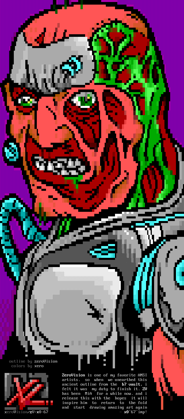outline by zeroVision colors by xero ZeroVision is one of my favorite ANSI artists. so when we unearthed this ancient outline from the b7 vault, i felt it was my duty to finish it. ZV has been MiA for a while now. and i release this with the hopes it will