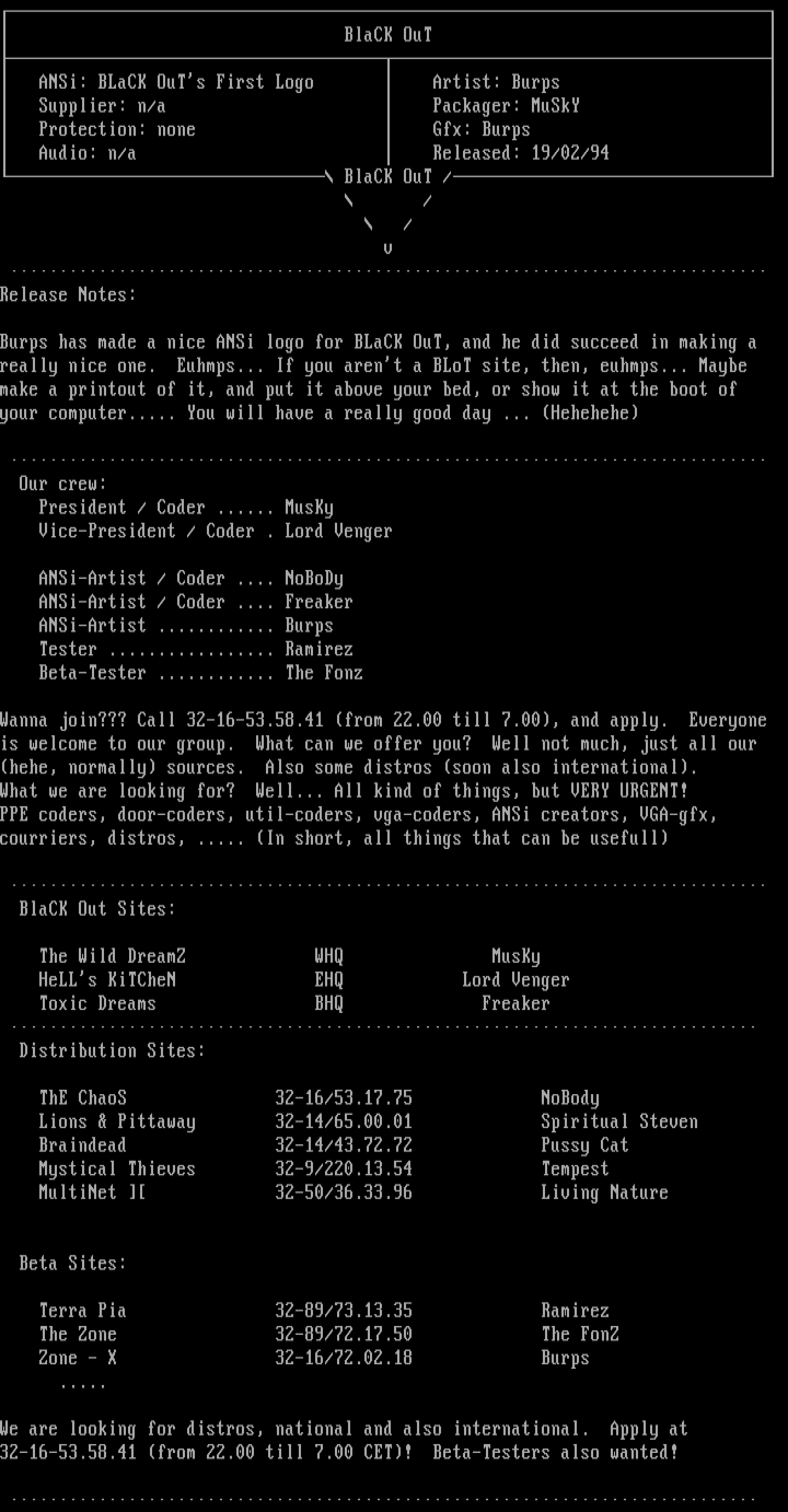 Burps has made a nice ANSi logo for BLaCK OuT, and he did succeed in making a