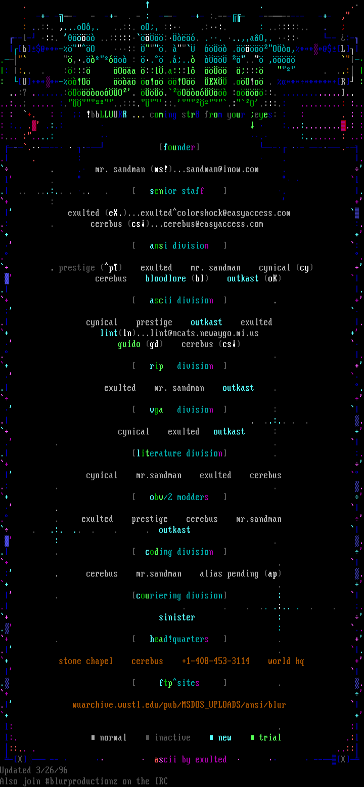 . . : . . . . mr. sandman ms!...sandman@inow.com . l . l . .. ...:.. . .. . senior staff . .+ : + exulted eX....exultedcolorshock@easyaccess.com .: . cerebus cs...cerebus@easyaccess.com :.+ + ansi division : . . . prestige pT exulted mr. sandman cynical cy cerebus bloodlore bl outkast oK . .+ ascii division . + : . cynical prestige outkast exulted .+ lintln...lint@ncats.newaygo.mi.us +