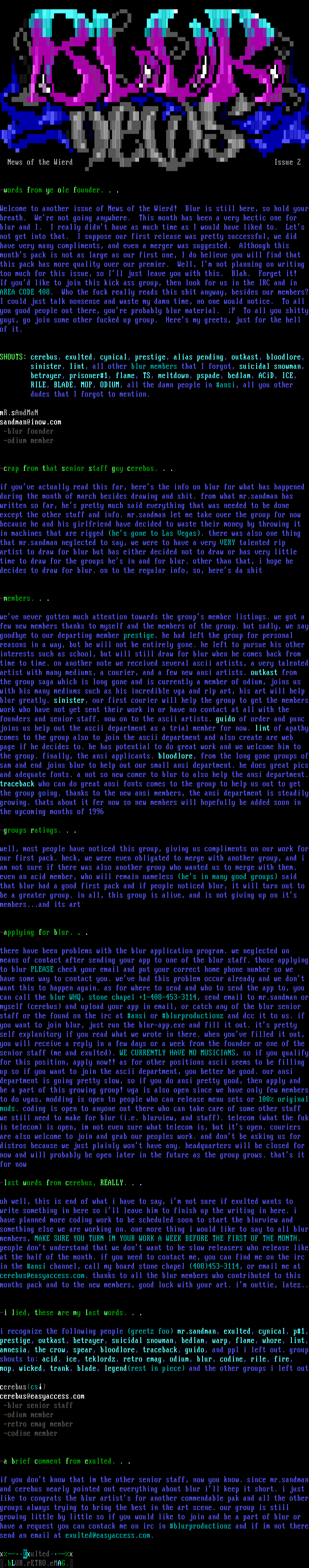 the group. finally, the ansi applicants. bloodlore, from the long gone groups ofsam and end joins blur to help out our small ansi department. he does great picsand adequate fonts. a not so new comer to blur to also help the ansi department.traceback who can do great ansi fonts comes to the group to help us out to get