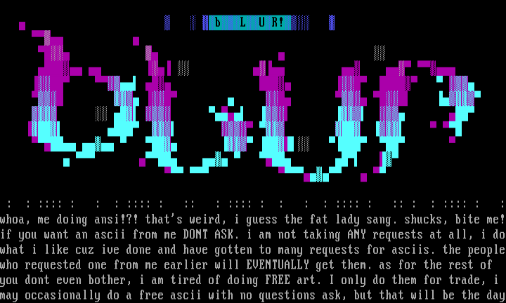 : : :::: : : : :::: : :: : :::: : : : : :::: : :: : : :::: : :whoa, me doing ansi!?! thats weird, i guess the fat lady sang. shucks, bite me!if you want an ascii from me DONT ASK. i am not taking ANY requests at all, i dowhat i like cuz ive done and have gotten to many requests for asciis. the peoplewho requested one from me earlier will EVENTUALLY get them. as for the rest of