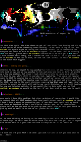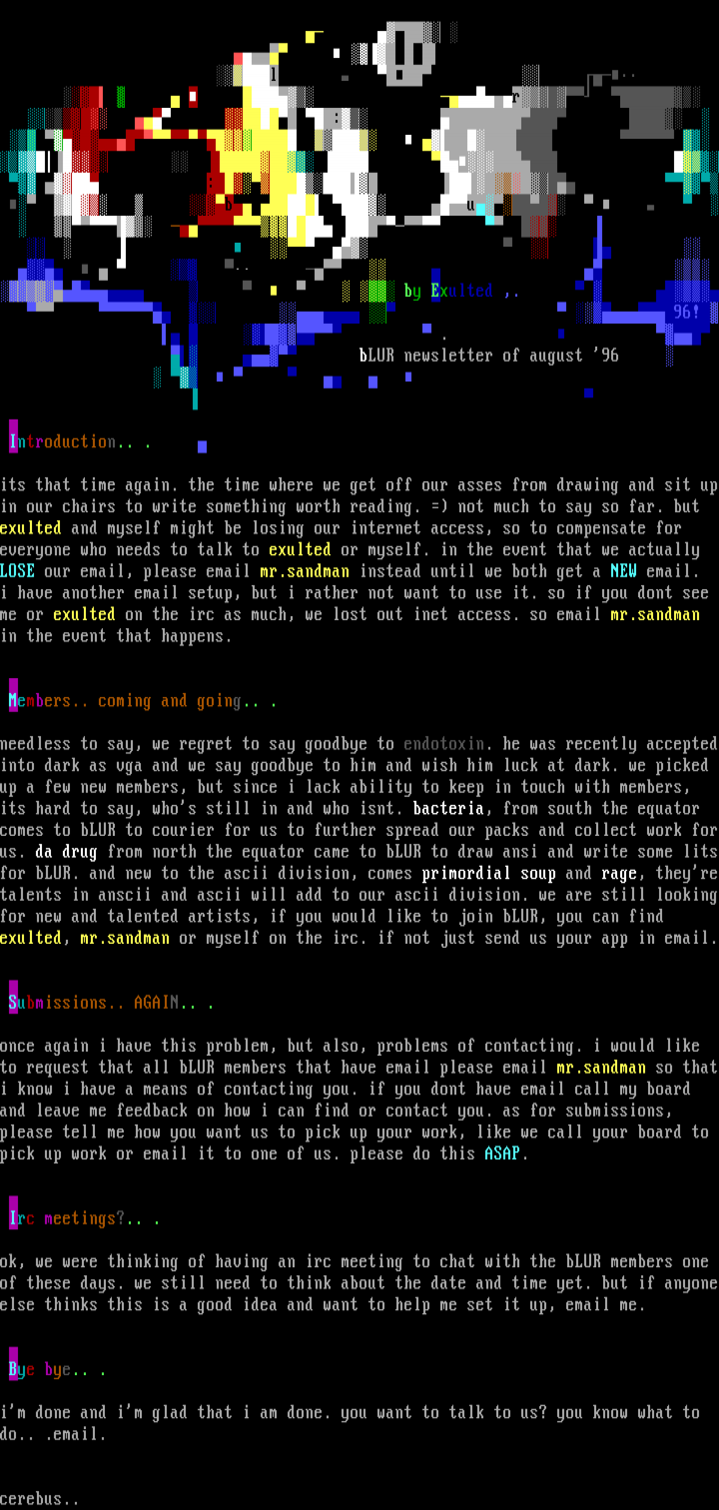 comes to bLUR to courier for us to further spread our packs and collect work forus. da drug from north the equator came to bLUR to draw ansi and write some litsfor bLUR. and new to the ascii division, comes primordial soup and rage, theyretalents in anscii and ascii will add to our ascii division. we are still lookingfor new and talented artists, if you would like to join bLUR, you can find