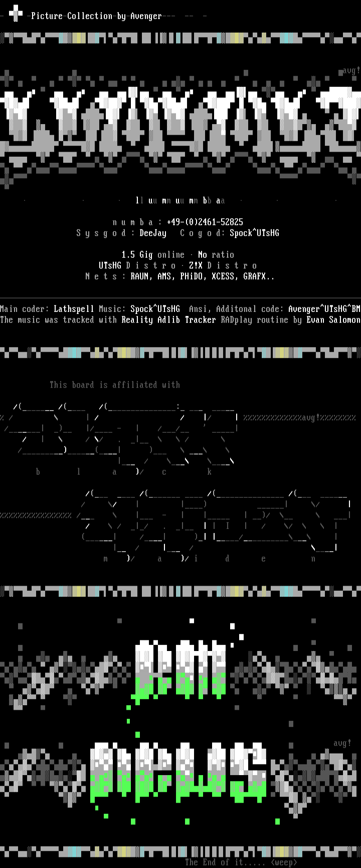 Main coder: Lathspell Music: SpockUTsHG Ansi, Additonal code: AvengerUTsHGBMThe music was tracked with Reality Adlib Tracker RADplay routine by Evan Salomon