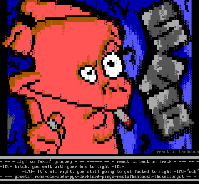 react of bamboosh- -- - sfg: so fakin groovey - -- ------ -- - react is back on track - --- -- --- bitch, you walk with your bra to tight --