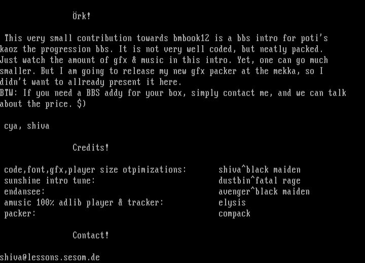 This very small contribution towards bmbook12 is a bbs intro for potis