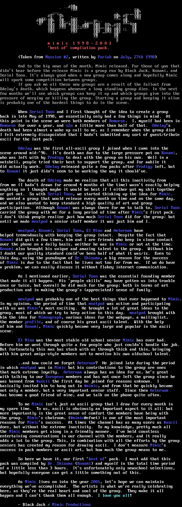 adds a lot to the group. This, in combination with all the efforts by the group seniors has created my reason for drawing ascii. I dont measure Mimics