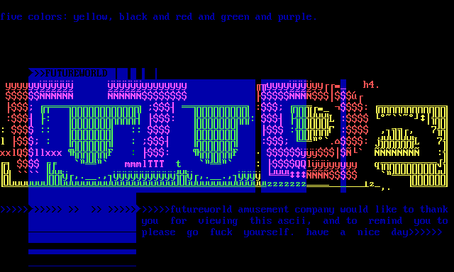 futureworld amusement company would like to thank you for viewing this ascii, and to remind you to please go fuck yourself. have a nice day