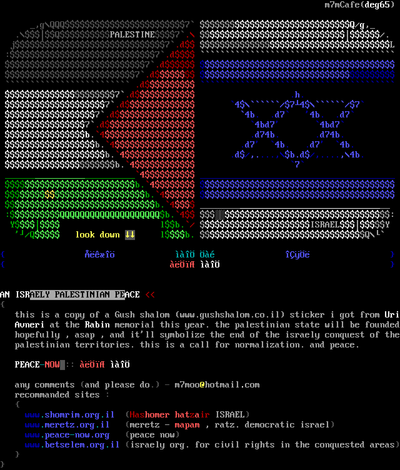 this is a copy of a Gush shalom www.gushshalom.co.il sticker i got from Uri Avneri at the Rabin memorial this year. the palestinian state will be founded hopefully , asap , and itll symbolize the end of the israely conquest of the palestinian territories. this is a call for normalization. and peace.