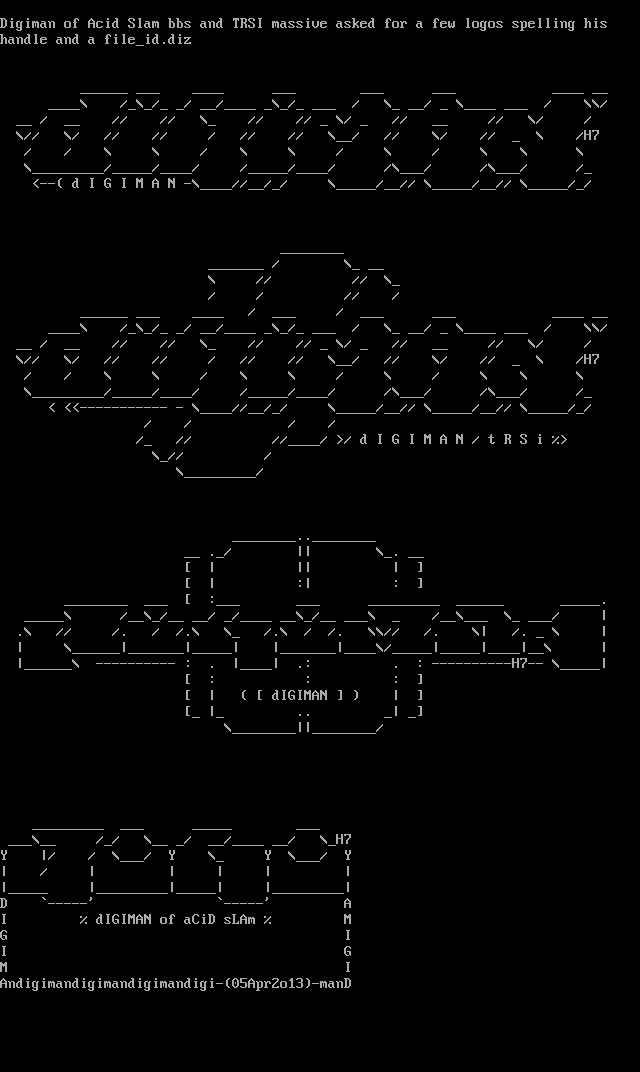 Digiman of Acid Slam bbs and TRSI massive asked for a few logos spelling his