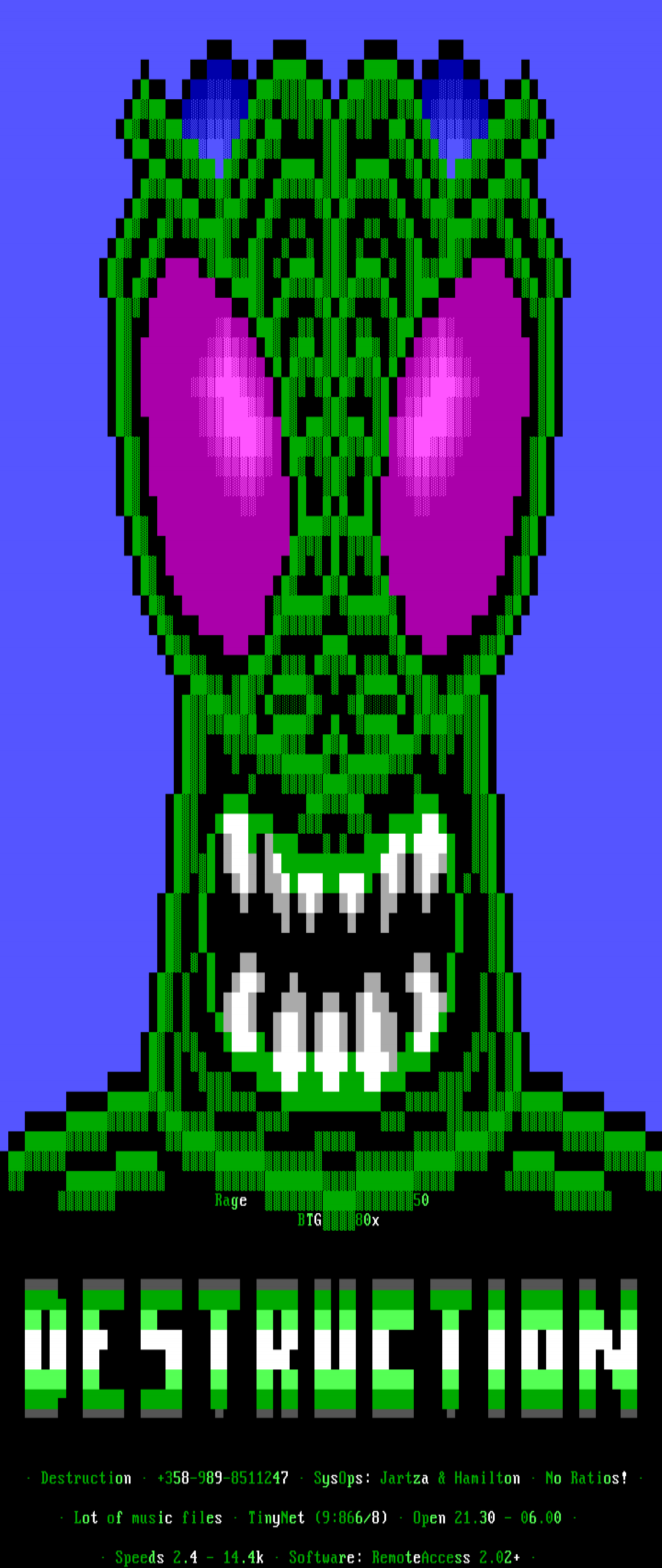 BTG80x Destruction +358-989-8511247 SysOps: Jartza Hamilton No Ratios! Lot of music files TinyNet 9:866/8 Open 21.30 - 06.00 Speeds 2.4 - 14.4k Software: RemoteAccess 2.02+