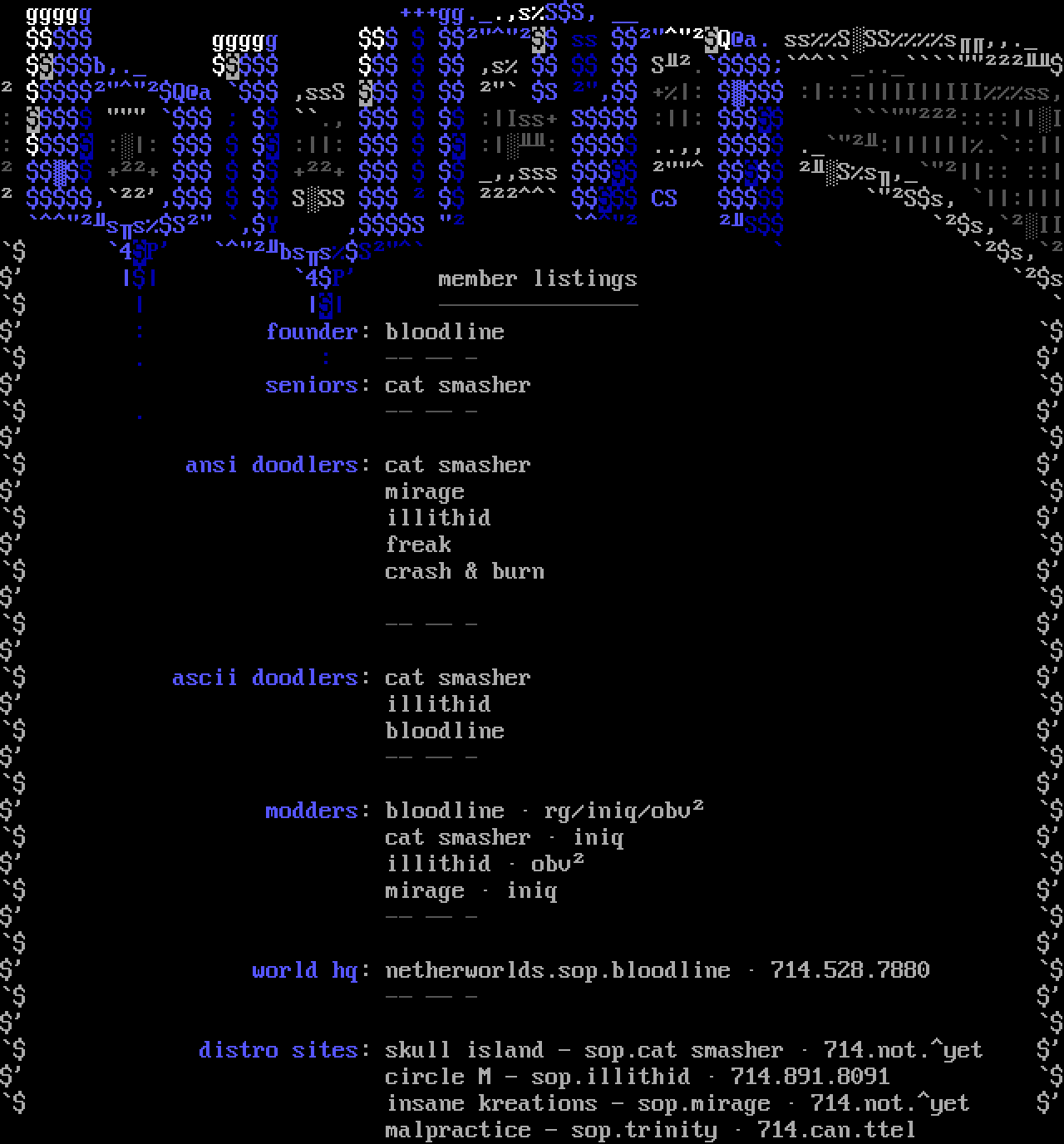 b,. ,s S... Q@a ,ssS S , +: ::::IIIIss,: ., :Iss+ S :: ::::I: :: :: :: ..,, .:.:: ++ ++ ,,sss Ss,:: :: ,, SSS CS Ss, : ssS ,Y ,S S s,II 4P bssS s, 4P member listings s : founder: bloodline . : - - seniors: cat smasher . - - ansi doodlers: cat smasher mirage illithid freak crash burn - - ascii doodlers: cat smasher illithid bloodline - - modders: bloodline rg/iniq/obv cat smasher iniq illithid obv mirage iniq - - world hq: netherworlds.sop.bloodline 714.528.7880 - - distro sites: skull island - sop.cat smasher 714.not.yet circle M - sop.illithid 714.891.8091 insane kreations - sop.mirage 714.not.yet malpractice - sop.trinity 714.can.ttel