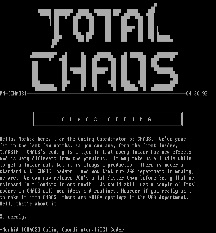 Hello, Morbid here, I am the Coding Coordinator of CHAOS. Weve gone