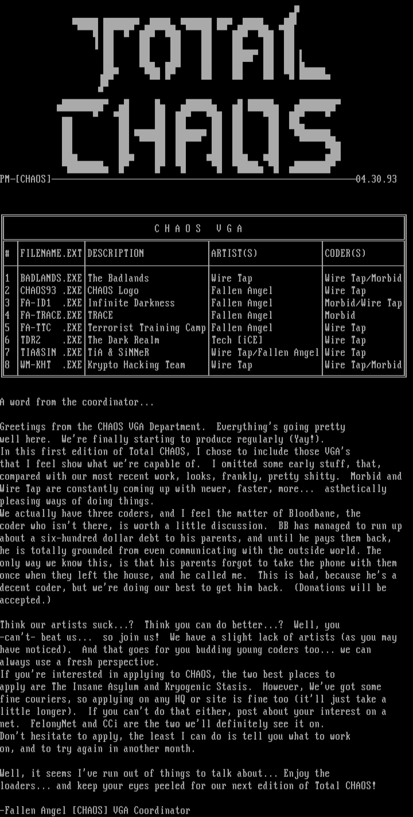Greetings from the CHAOS VGA Department. Everythings going pretty