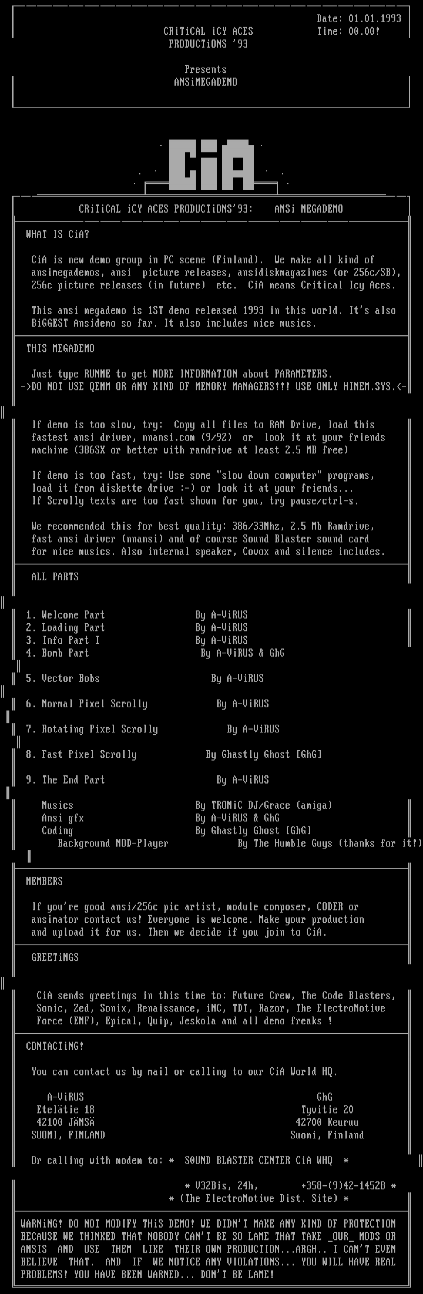 This ansi megademo is 1ST demo released 1993 in this world. Its also