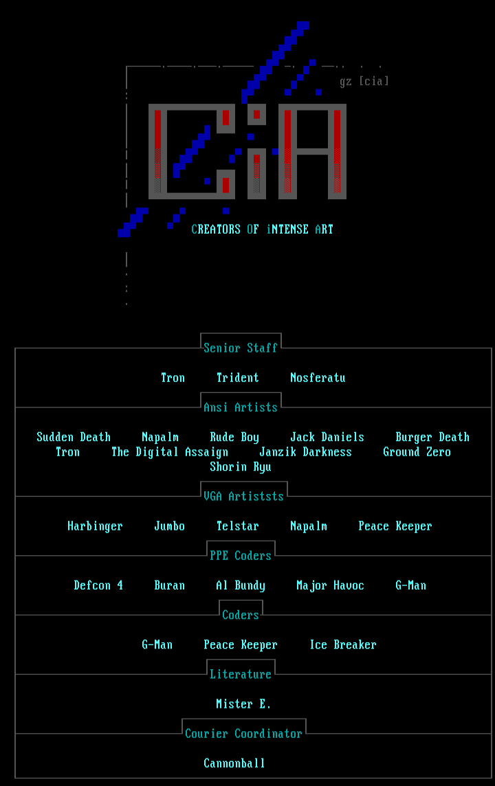 Senior Staff Tron Trident Nosferatu Ansi Artists Sudden Death Napalm Rude Boy Jack Daniels Burger Death Tron The Digital Assaign Janzik Darkness Ground Zero Shorin Ryu VGA Artiststs Harbinger Jumbo Telstar Napalm Peace Keeper PPE Coders Defcon 4 Buran Al Bundy Major Havoc G-Man Coders G-Man Peace Keeper Ice Breaker Literature Mister E. Courier Coordinator Cannonball