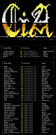aragon (1) cia (3) digital assasin (2) gore (2) grim humor (5) ground zero (1) ice breaker (1) jumbo (2) living death (2) mandor (1) mister e (6) napalm (6) obelisk (3) prozac (3) scribble-cia (5) sole assassin (7) sudden death (1) telstar (1) tron (4)