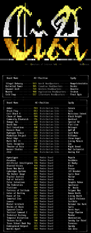 blurr (2) cia (5) dark matter (1) demon death (5) digital assasin (2) drakkhen (2) frost byte (2) mandor (4) mister e (1) napalm (6) nosferatu (1) obelisk (2) prozac (2) questor (1) scribble-cia (3) spanky (1) sudden death (6) the rudeboy (1) trident (1) tron (1) widdle penis (11)