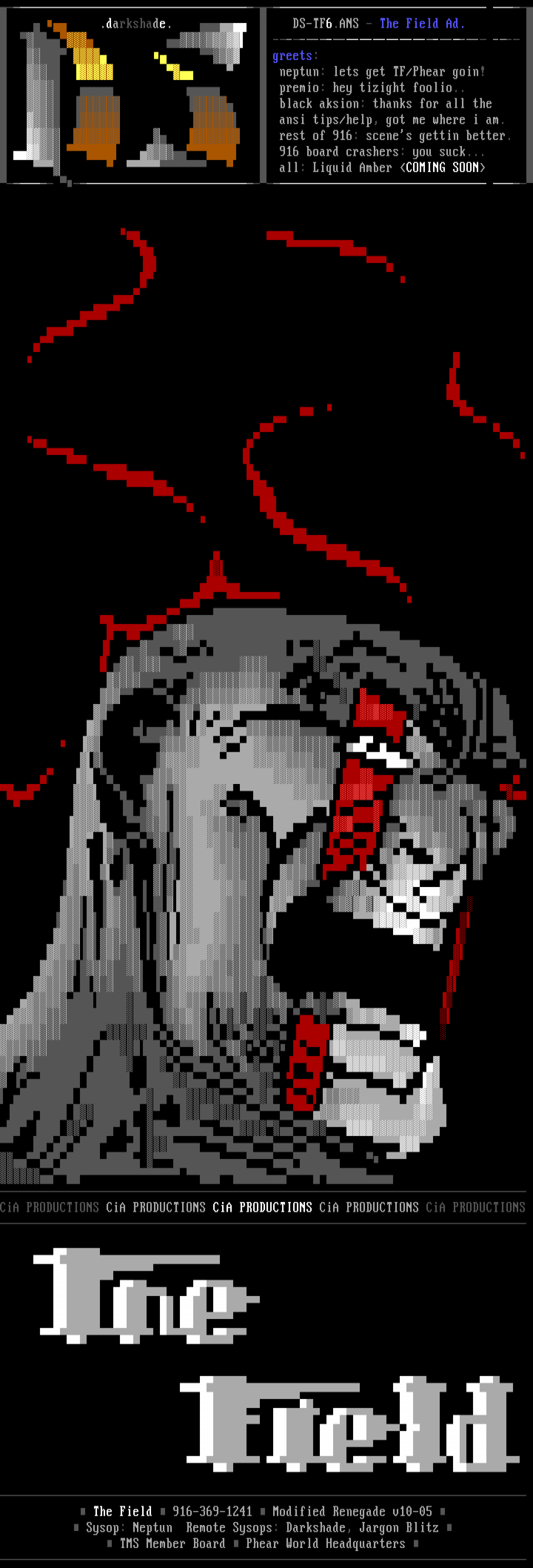.darkshade. DS-TF6.ANS - The Field Ad. ---------------- -- greets: neptun: lets get TF/Phear goin! premio: hey tizight foolio.. black aksion: thanks for all the ansi tips/help, got me where i am. rest of 916: scenes gettin better. 916 board crashers: you suck... all: Liquid Amber COMING SOON