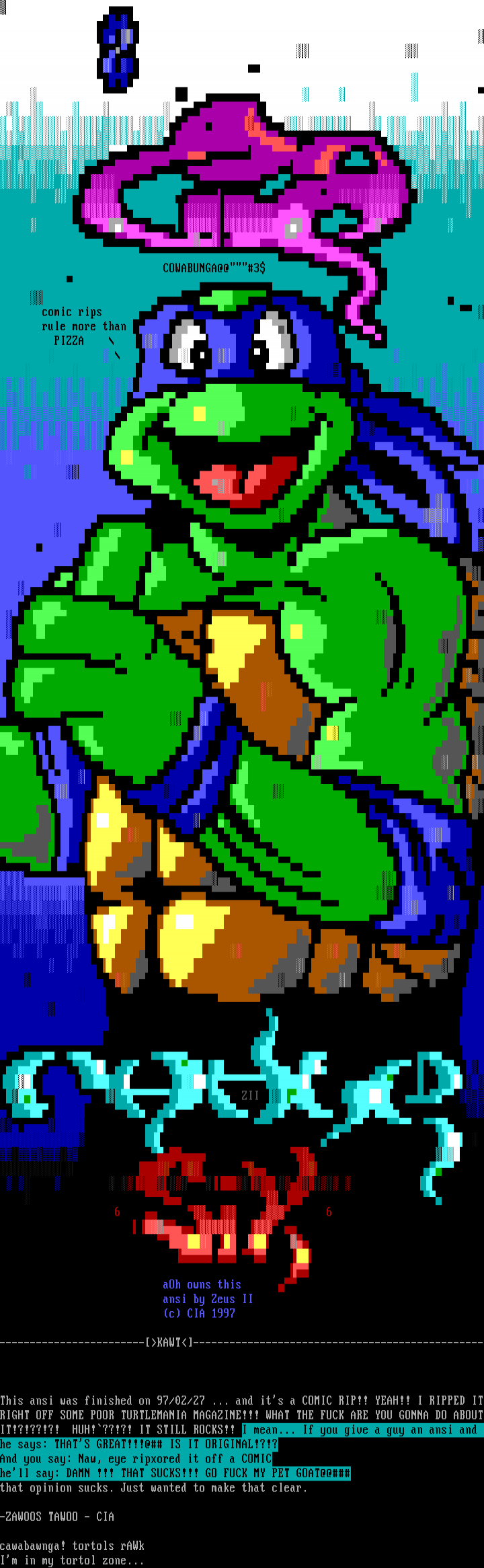 This ansi was finished on 97/02/27 ... and its a COMIC RIP!! YEAH!! I RIPPED ITRIGHT OFF SOME POOR TURTLEMANIA MAGAZINE!!! WHAT THE FUCK ARE YOU GONNA DO ABOUTIT!?!??!?! HUH!??!?! IT STILL ROCKS!! I mean... If you give a guy an ansi and