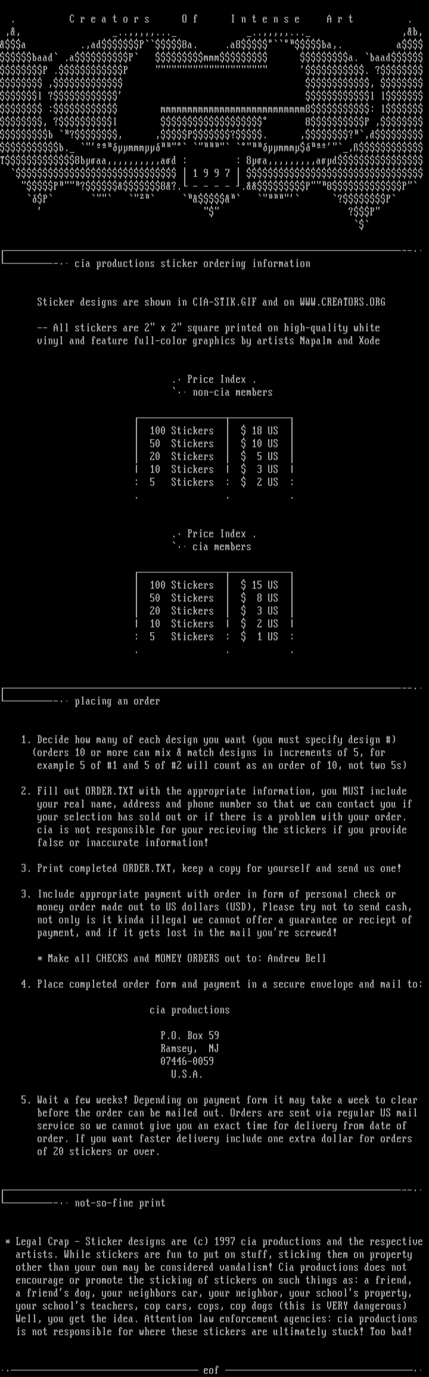 Sticker designs are shown in CIA-STIK.GIF and on WWW.CREATORS.ORG