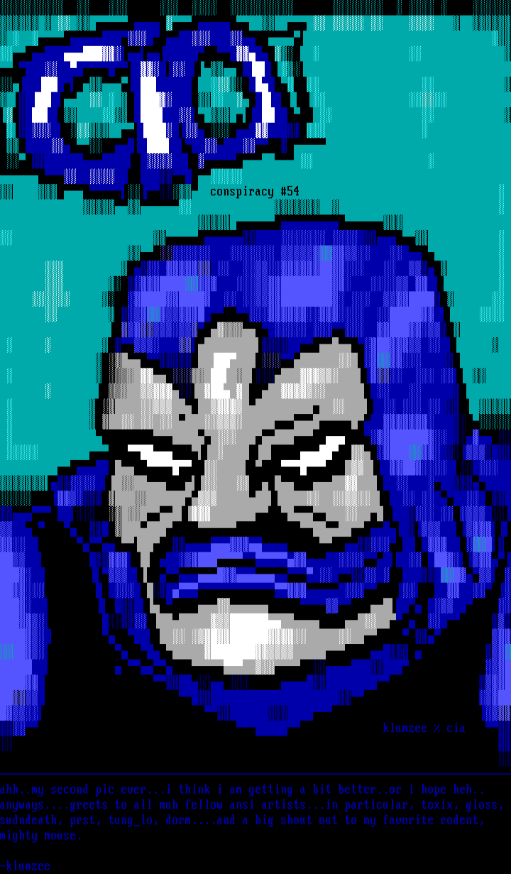 anyways....greets to all muh fellow ansi artists...in particular, toxix, gloss, sudndeath, prst, tunglo, dorm....and a big shout out to my favorite rodent,