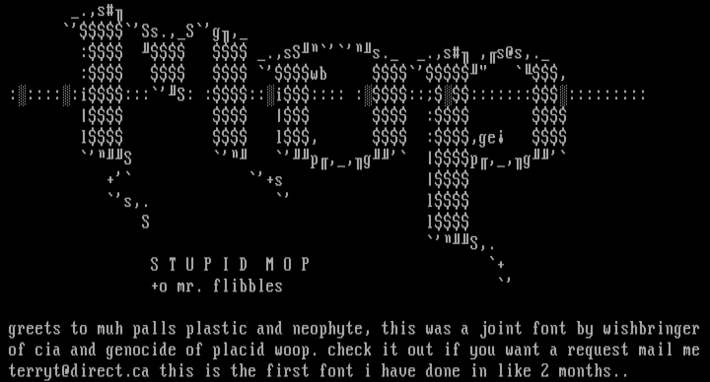 greets to muh palls plastic and neophyte, this was a joint font by wishbringer of cia and genocide of placid woop. check it out if you want a request mail me terryt@direct.ca this is the first font i have done in like 2 months..