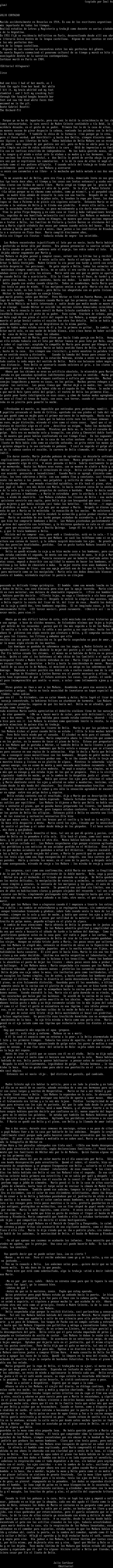 Se acordaba ahora del pez de color muerto en el da anunciado por Delia. Slo una honda desesperacin pudo arrastrarlo. Quem el sobre, el recorte, hizo un recuento de sospechosos y se propuso franquearse con Delia , salvarla en s mismo de los hilos de baba, del rezumar intolerable de esos rumores. A los cinco das no haba hablado con Delia ni con los Maara vino el segundo. En una cartulina celeste haba primero una estrellita no se saba por qu y despus : Yo que usted tendra cuidado con el escaln de la cancel. Del sobre sali un perfume vago a jabn de almendra. Mario pens si la de la casa de altos usara jabn de almendra, hasta tuvo el torpe valor de revisar la cmoda de Madre Celeste y de su hermana. Tambin quem ese annimo, tampoco le dijo nada a Delia. Era en diciembre, con el calor de esos diciembres veintitantos, ahora iba despus de cenar a lo de Delia y hablaban pasendose por el jardincito de atrs o dando vuelta a la manzana. Con el calor coman menos bombones, no que Delia renunciara a sus ensayos pero traa pocas muestras a la sala, prefera guardarlos en cajas antiguas, protegidos en moldecitos, con un fino csped de papel verde claro por encima. Mario la not inquieta, como alerta. A veces miraba hacia atrs en las esquinas, y la noche que hizo un gesto de rechazo al llegar al buzn de Medrano y Rivadavia, Mario comprendi que tembin a ella la estaban torturando desde lejos que compartan sin decirlo el mismo hostigamiento.