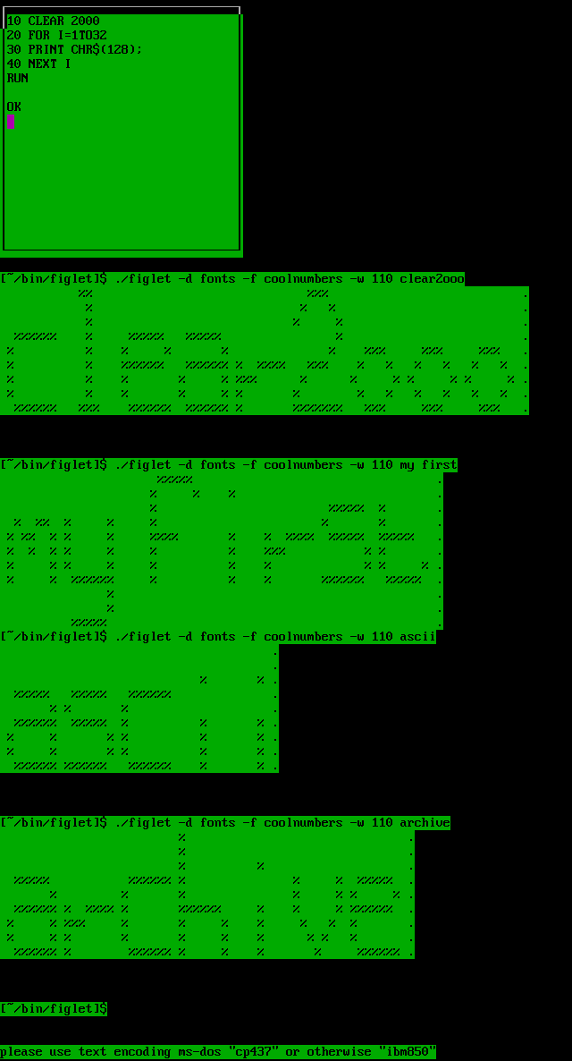 /bin/figlet ./figlet -d fonts -f coolnumbers -w 110 clear2ooo