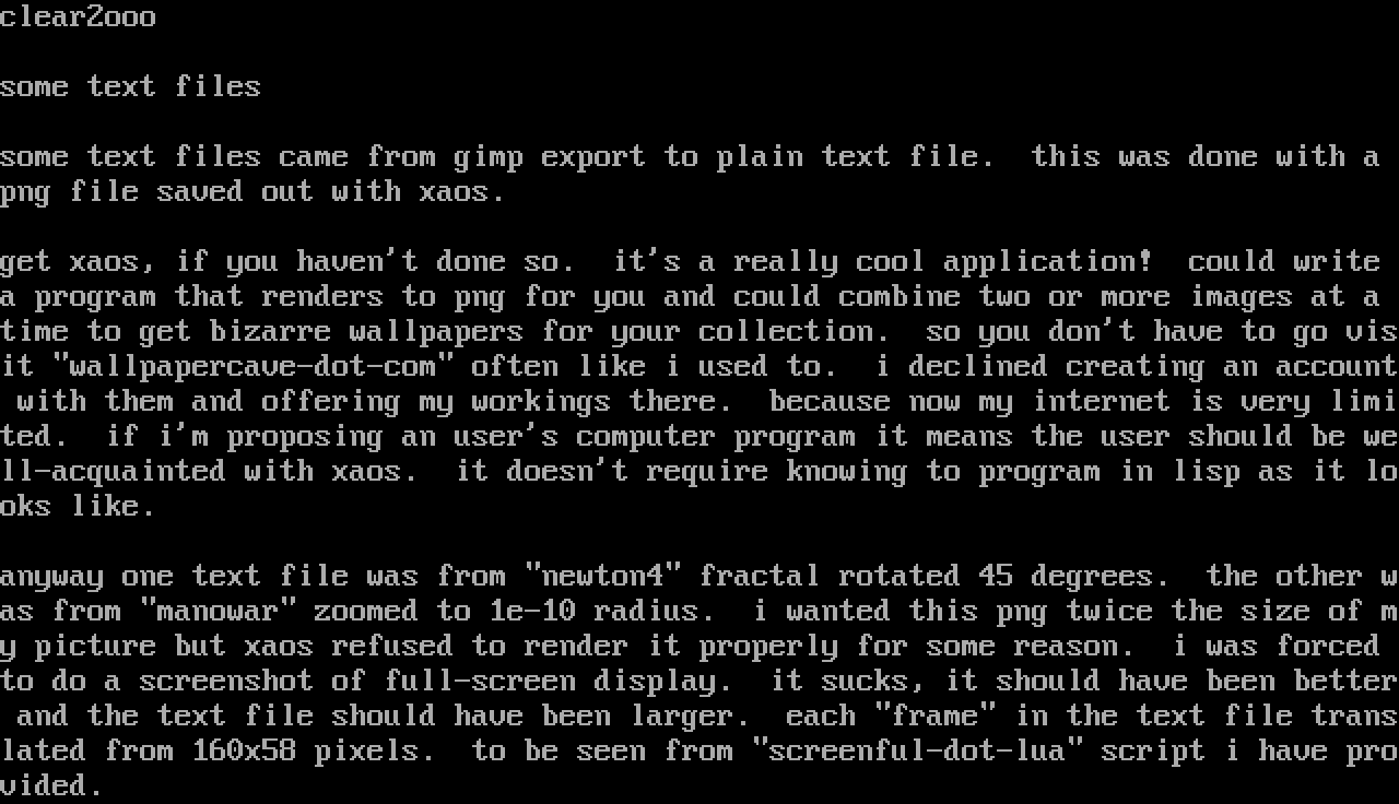 anyway one text file was from newton4 fractal rotated 45 degrees. the other was from manowar zoomed to 1e-10 radius. i wanted this png twice the size of my picture but xaos refused to render it properly for some reason. i was forced to do a screenshot of full-screen display. it sucks, it should have been better and the text file should have been larger. each frame in the text file translated from 160x58 pixels. to be seen from screenful-dot-lua script i have provided.