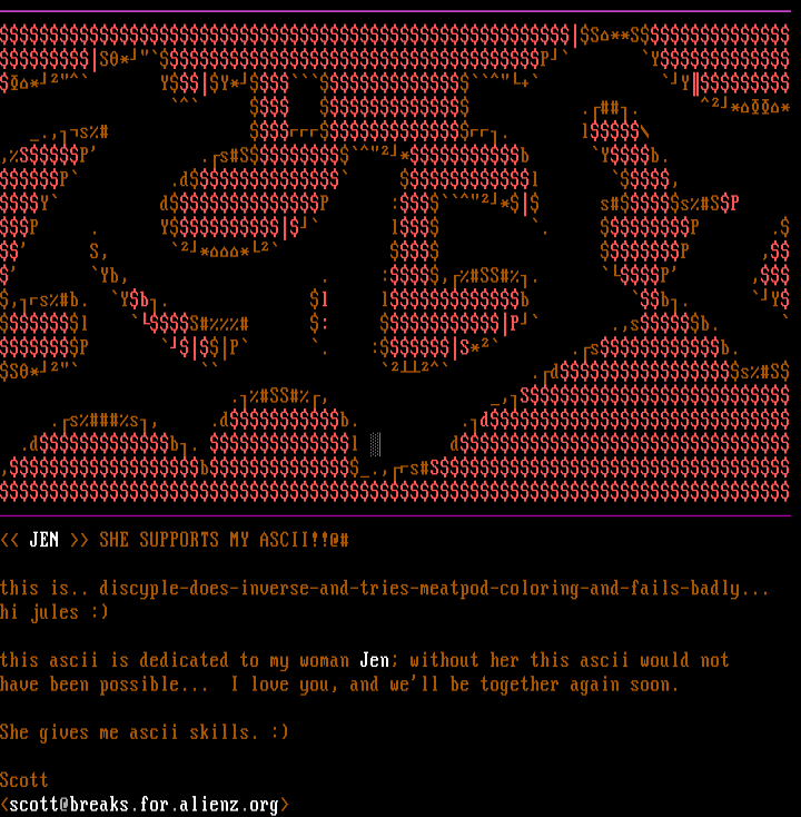 this ascii is dedicated to my woman Jen without her this ascii would not