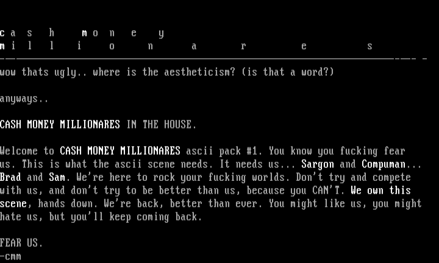 Welcome to CASH MONEY MILLIONARES ascii pack 1. You know you fucking fear