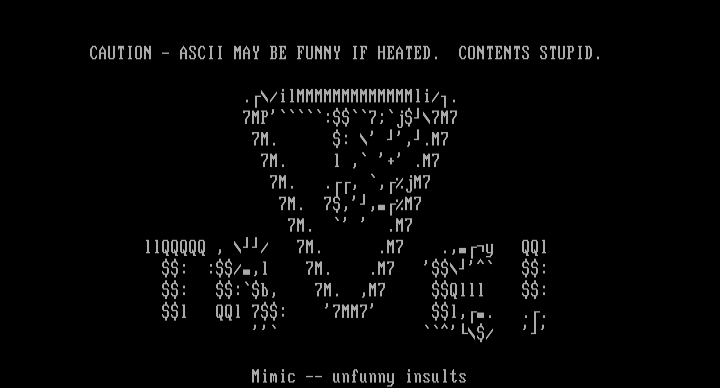 CAUTION - ASCII MAY BE FUNNY IF HEATED. CONTENTS STUPID.