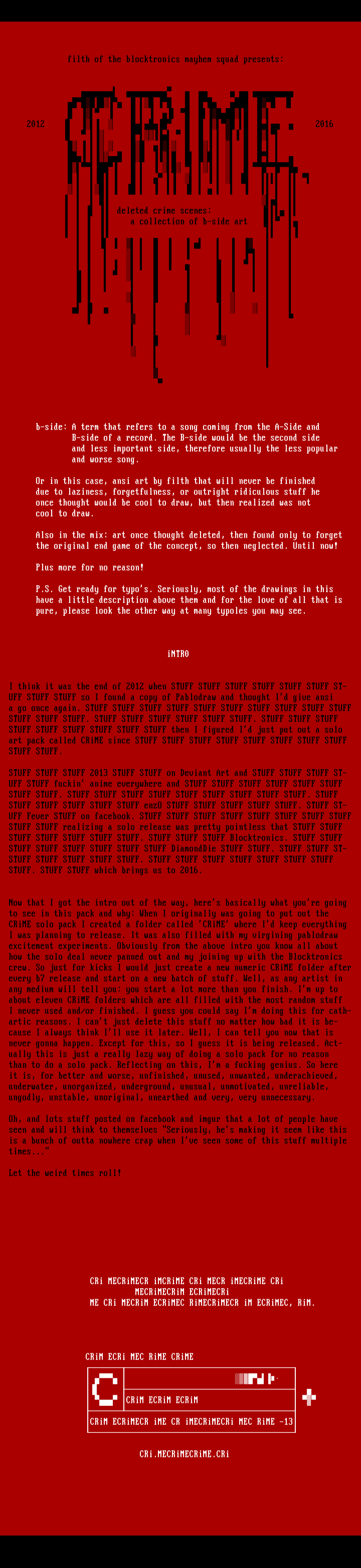 filth of the blocktronics mayhem squad presents: 2012 2016 deleted crime scenes:a collection of b-side art b-side: A term that refers to a song coming from theA-Side and B-side of a record. The B-side would be the second side and less important side, therefore usually the less popularand worse song.Or in this case, ansi art by filth that will never be finisheddue to laziness, forgetfulness, or outright ridiculous stuff he once thought would be cool to draw, but then realized was not cool to draw.Also in the mix: art once thought deleted, then found only to forget the original end game of the concept, so then neglected. Until now!Plus more for no reason!P.S. Get ready for typos. Seriously, most of the drawings in thishave a little description above them and for the love of all that is pure, please look the other way at many typoles you may see. iNTR0I think it was the end of 2012 when STUFF STUFF STUFF STUFF STUFF STUFF ST- UFF STUFF STUFF so I found a copy of Pablodraw and thought Id give ansi a go once again. STUFF STUFF STUFF STUFF STUFF STUFF STUFF STUFF STUFF STUFF STUFF STUFF STUFF. STUFF STUFF STUFF STUFF STUFF STUFF. STUFF STUFF STUFF STUFF STUFF STUFF STUFF STUFF STUFF then I figured Id just put out a solo art pack called CRiME since STUFF STUFF STUFF STUFF STUFF STUFF STUFF STUFF STUFF STUFF. STUFF STUFF STUFF 2013 STUFF STUFF on Deviant Art and STUFF STUFF STUFF ST- UFF STUFF fuckin anime everywhere and STUFF STUFF STUFF STUFF STUFF STUFF STUFF STUFF. STUFF STUFF STUFF STUFF STUFF STUFF STUFF STUFF STUFF. STUFF STUFF STUFF STUFF STUFF STUFF enzO STUFF STUFF STUFF STUFF STUFF. STUFF ST- UFF Fever STUFF on facebook. STUFF STUFF STUFF STUFF STUFF STUFF STUFF STUFF STUFF STUFF realizing a solo release was pretty pointless that STUFF STUFF STUFF STUFF STUFF STUFF STUFF. STUFF STUFF STUFF Blocktronics. STUFF STUFF STUFF STUFF STUFF STUFF STUFF STUFF DiamondDie STUFF STUFF. STUFF STUFF ST- STUFF STUFF STUFF STUFF STUFF. STUFF STUFF STUFF STUFF STUFF STUFF STUFF STUFF. STUFF STUFF which brings us to 2016.Now that I got the intro out of the way, heres basically what youre going to see in this pack and why: When I originally was going to put out the CRiME solo pack I created a folder called CRiME where Id keep everything I was planning to release. It was also filled with my virgining pablodraw excitement experiments. Obviously from the above intro you know all about how the solo deal never panned out and my joining up with the Blocktronics crew. So just for kicks I would just create a new numeric CRiME folder after every b7 release and start on a new batch of stuff. Well, as any artist in any medium will tell you: you start a lot more than you finish.Im up to about eleven CRiME folders which are all filled with the most random stuff I never used and/or finished. I guess you could say Im doing this for cath- artic reasons. I cant just delete this stuff no matter how bad it is be- cause I always think Ill use it later. Well, I can tell you now that is never gonna happen. Except for this, so I guess it is being released. Act- ually this is just a really lazy way of doing a solo pack for no reason than to do a solo pack. Reflecting on this, Im a fucking genius. So here it is, for better and worse, unfinished, unused, unwanted, underachieved, underwater, unorganized, underground, unusual, unmotivated, unreliable, ungodly, unstable, unoriginal, unearthed and very, very unnecessary. Oh, and lots stuff posted on facebook and imgur that a lot of people have seen and will think to themselves Seriously, hes making it seem like this is a bunch of outta nowhere crap when Ive seen some of this stuff multiple times... Let the weird times roll! CRi MECRiMECR iMCRiME CRi MECR iMECRiME CRiMECRiMECRiM ECRiMECRi ME CRi MECRiM ECRiMEC RiMECRiMECR iM ECRiMEC, RiM. CRiM ECRi MEC RiME CRiME CRiM ECRiM ECRiMCRiM ECRiMECR iME CR iMECRiMECRi MEC RiME -13 CRi.MECRiMECRiME.CRi