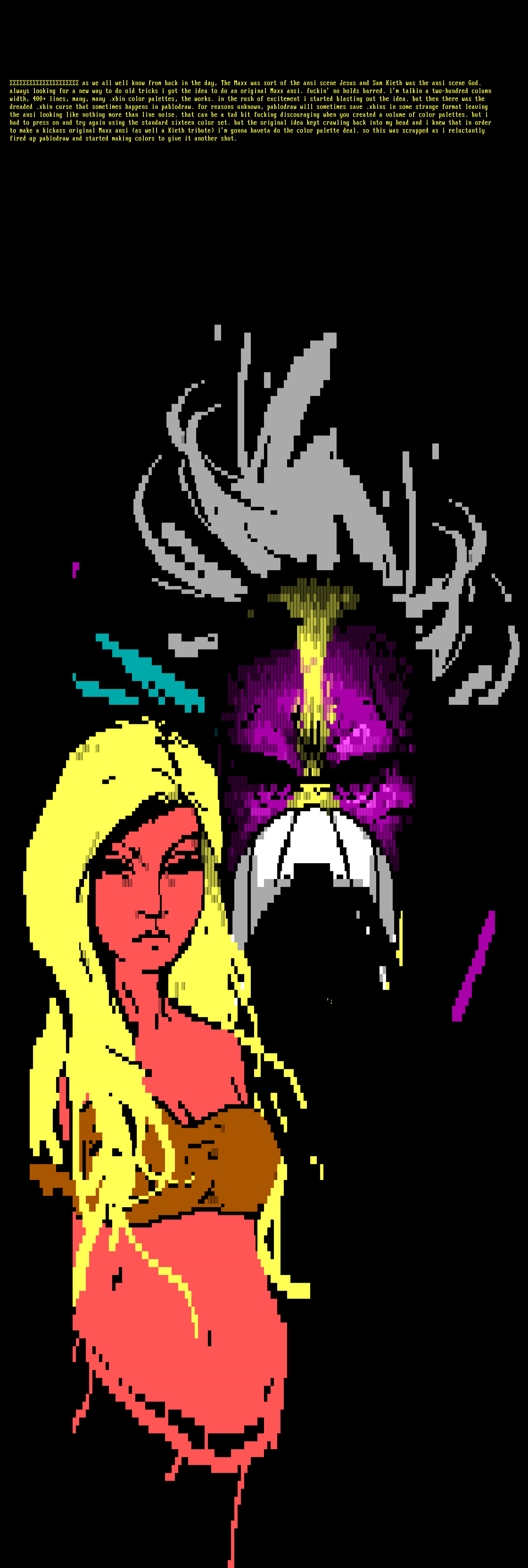 width, 400+ lines, many, many .xbin color palettes, the works. in the rush of excitement i started blasting out the idea. but then there was the