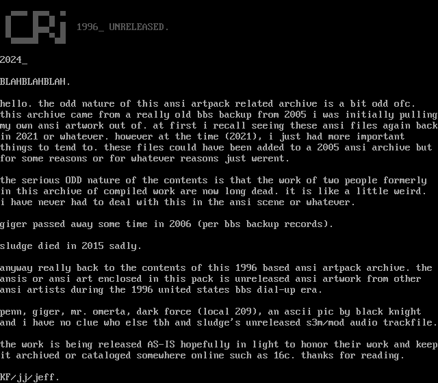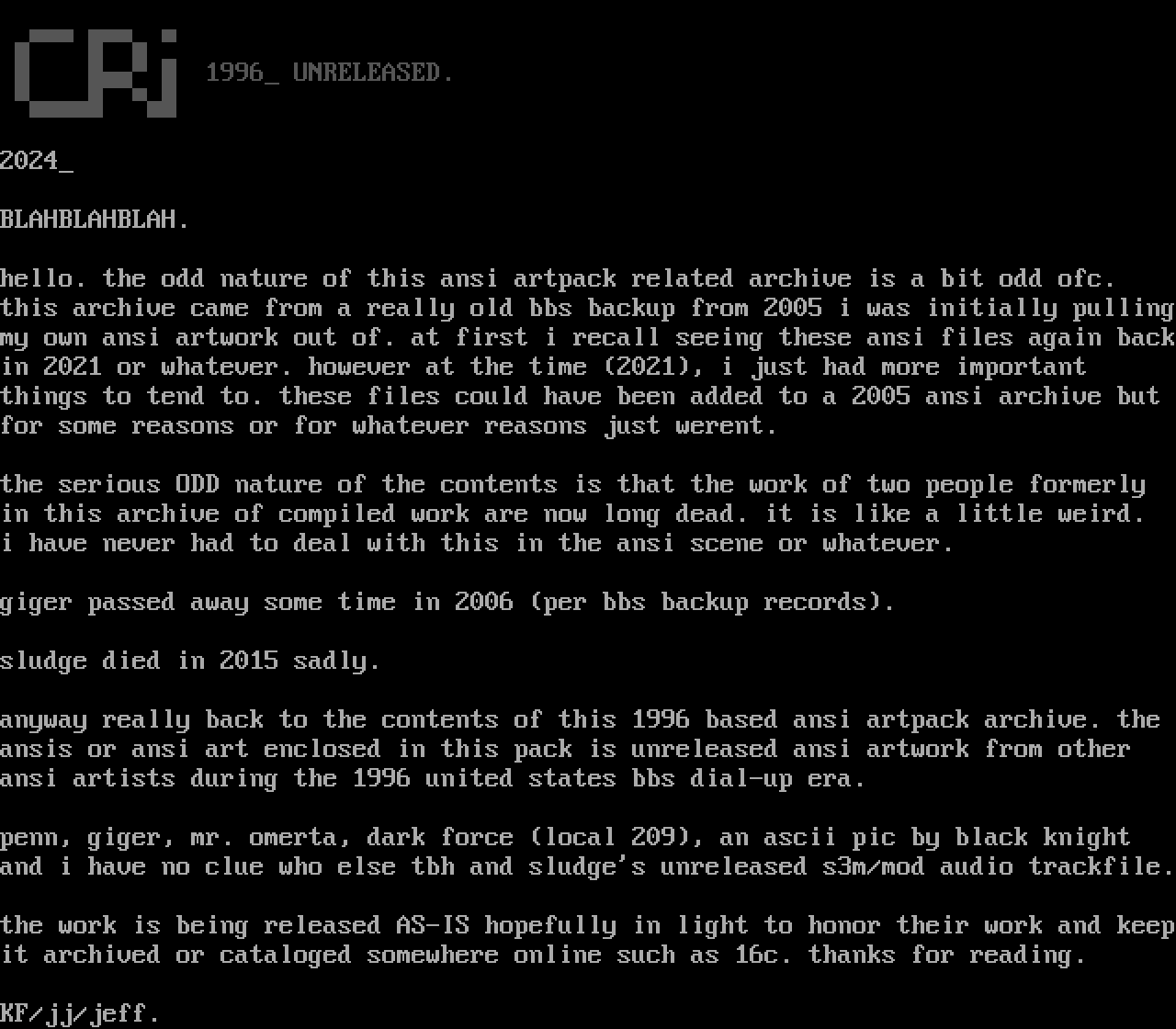 this archive came from a really old bbs backup from 2005 i was initially pullingmy own ansi artwork out of. at first i recall seeing these ansi files again backin 2021 or whatever. however at the time 2021, i just had more important
