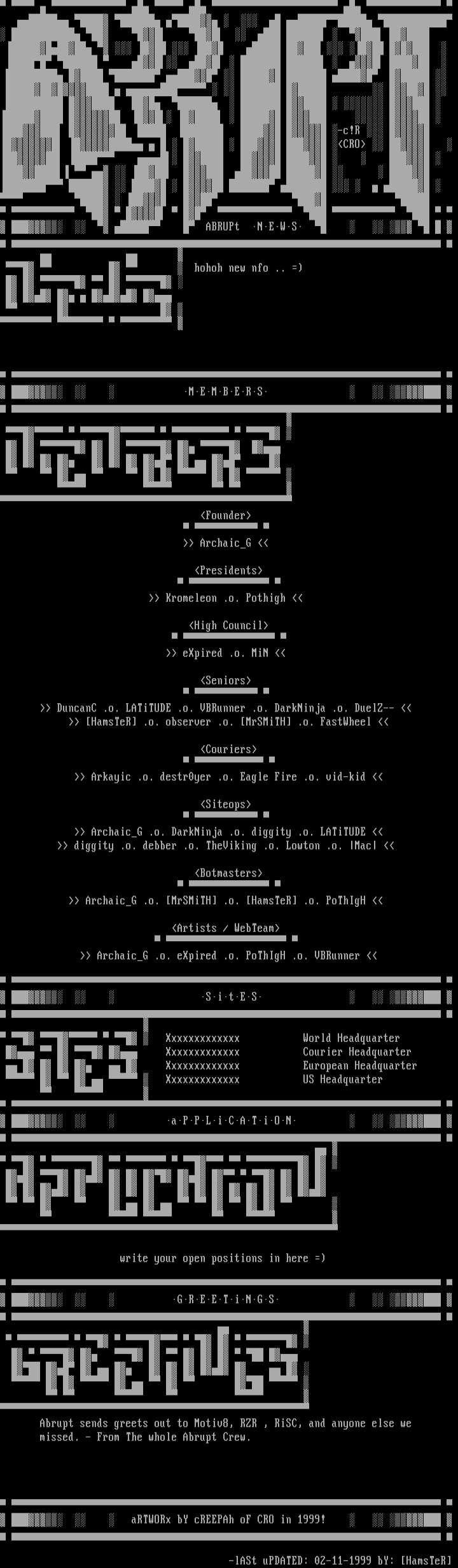 Abrupt sends greets out to Motiv8, RZR , RiSC, and anyone else we